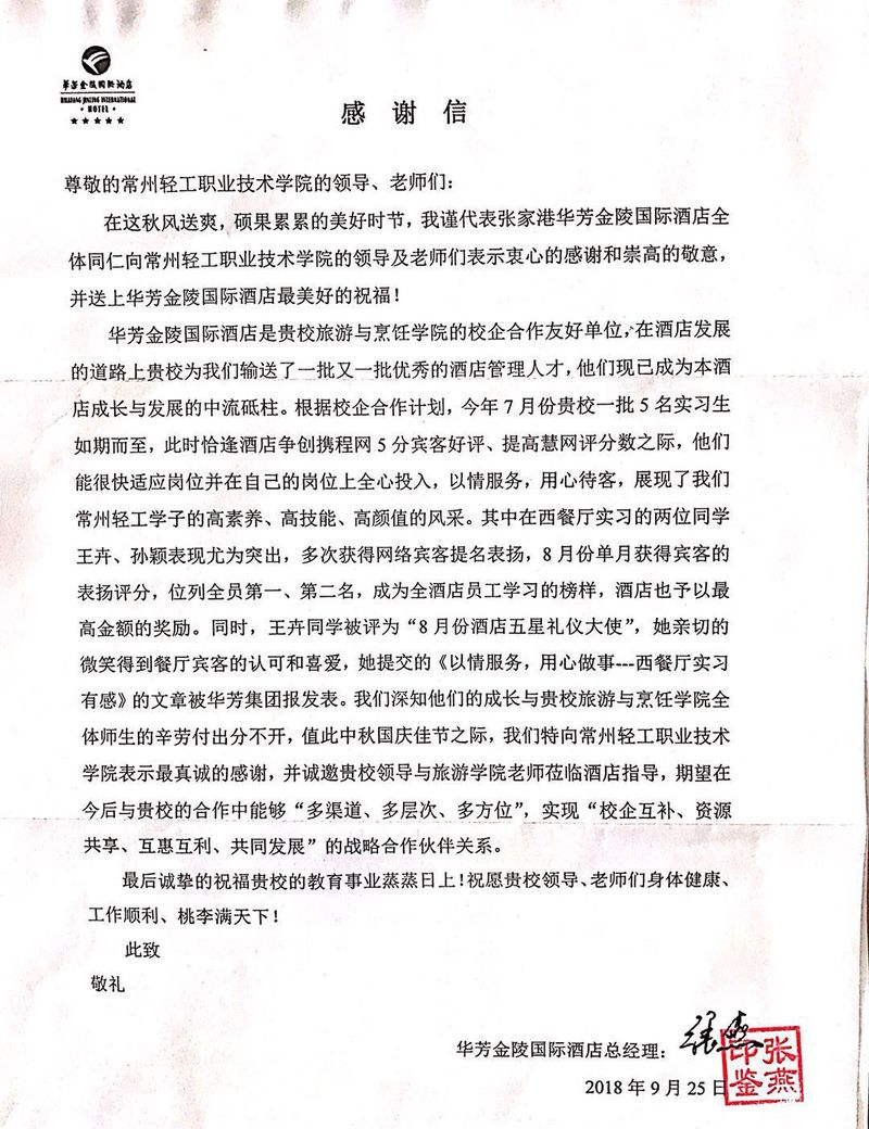 近日,公司旅游与烹饪公司校企合作单位——张家港华芳金陵国际酒店发来一封感谢信。