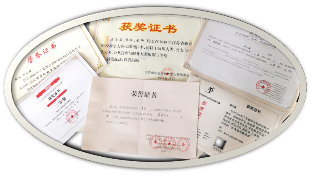 专业教师团队结构合理,锐意进取,在各级各类竞赛中屡获佳绩,近三年获江苏省高职院校信息化教学大赛一等奖1项,二等奖1项;江苏省职业院校教学能力大赛高职组三等奖1项;江苏省高校微课教学比赛二等奖1项。指导员工参加省市技能竞赛,获“外研社杯”全国英语演讲大赛(江苏赛区)获一等奖1项,三等奖2项;“外研社杯”全国英语写作大赛(江苏赛区)二等奖2项,三等奖1项;江苏省高职院校艺术插花技能大赛二等奖1项,三等奖1项;江苏省高等职业院校技能大赛英语口语赛项三等奖1项,学前教育专业教育技能赛项三等奖2项。