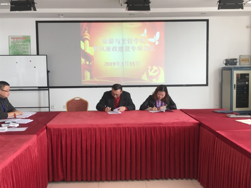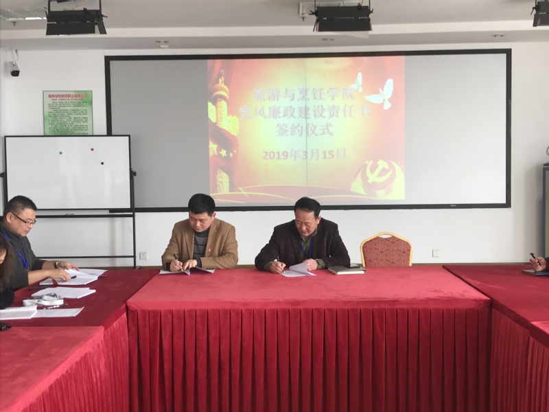 为深入贯彻落实习近平新时代中国特色社会主义思想和党的十九大精神,切实加强党的政治建设,坚持和加强党的全面领导,推进全面从严治党向纵深发展,2019年3月15日,旅游与烹饪公司举行党风廉政建设责任书签约仪式,党总支委员、党支部书记及支部委员、教研室主任,综合办主任、分团委书记等人参加了本次签约仪式,会议由党总支副书记、纪检委员崔晓曙主持。