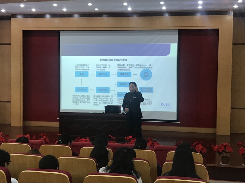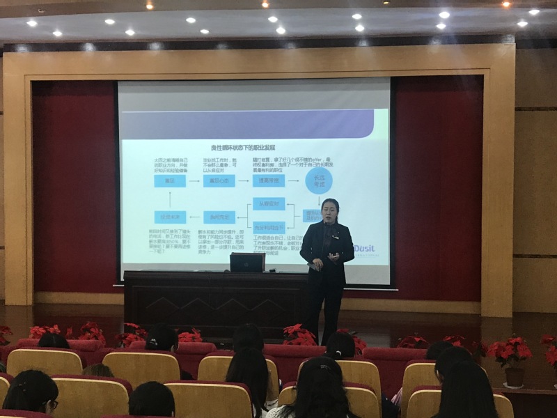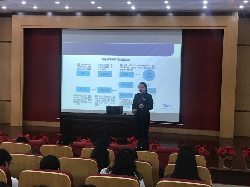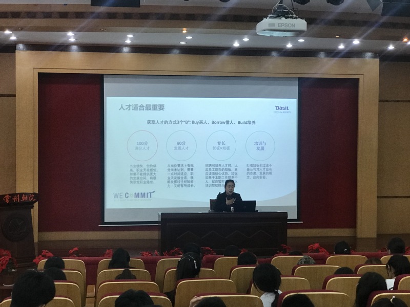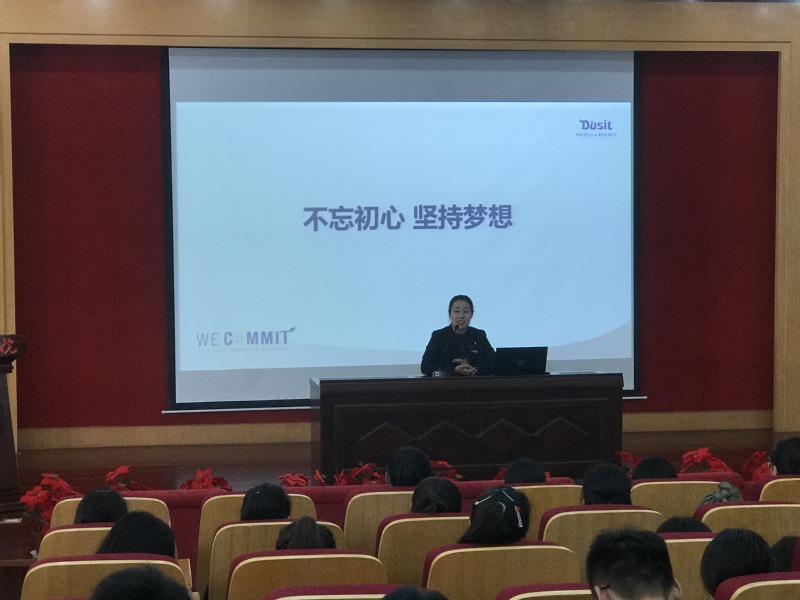 为进一步引导2019级新生做好职业规划设计,2019年9月12日,旅游与烹饪公司组织开展了“悦耳思语”系列讲座之职业生涯规划专项讲座。常州都喜天丽富都大酒店人力资源部经理蒋美琴女士受邀做了“不忘初心 坚持梦想”的主题讲座。