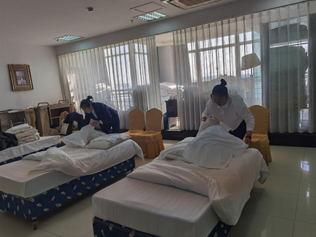 本次比赛共设中餐宴会摆台、中式铺床两个子项目,酒店管理专业在校班员工全部参加了比赛。经过角逐,最终,由20酒管331班谢珊珊和韩金郁获得中餐宴会摆台一等奖,20酒管331班廖启萍获得中式铺床一等奖。