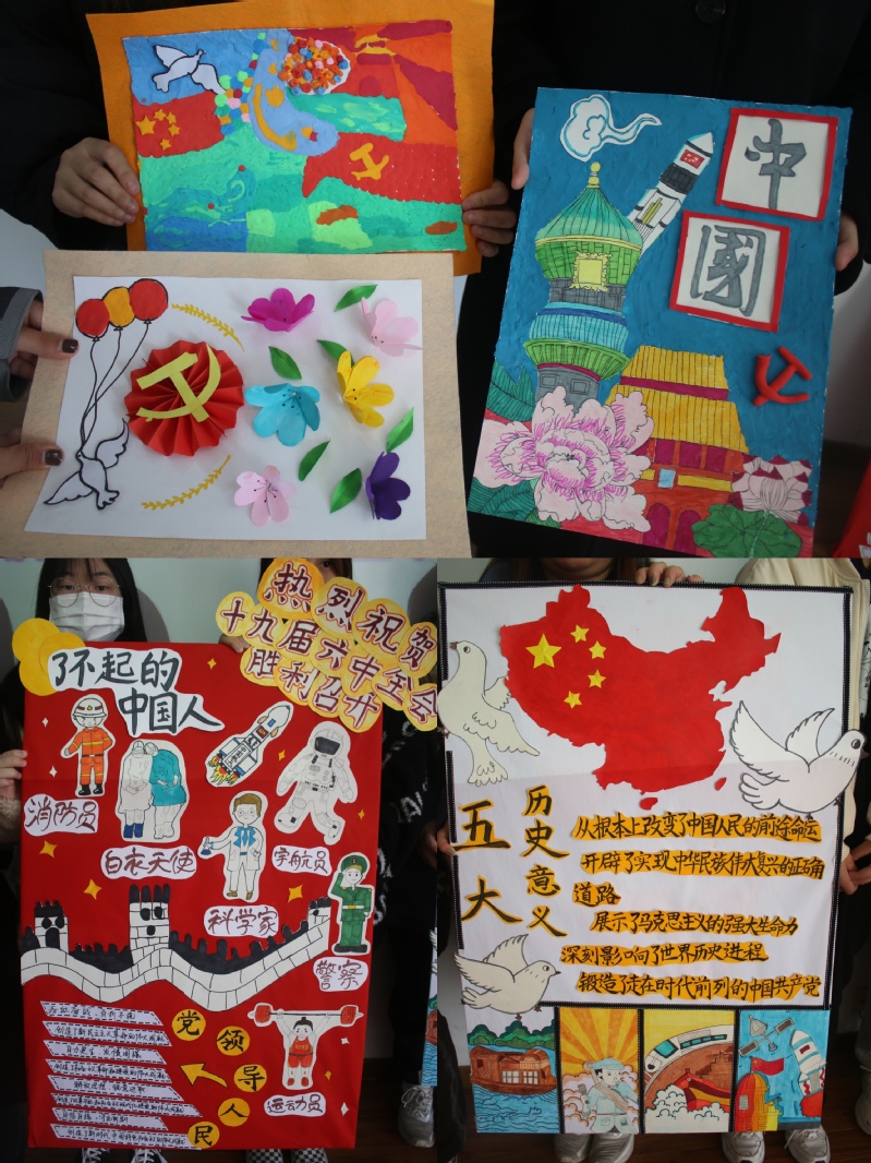 活动通过对党的十九届六中全会精神的专题学习,幼儿专业的同学们将自己领悟到的会议精神融入到自己的创意手工作品中,利用生活废料、软硬卡纸、太空泥等材料进行DIY制作,创作出“了不起的中国人”“党百年奋斗的五大历史意义”等各具特色的作品。