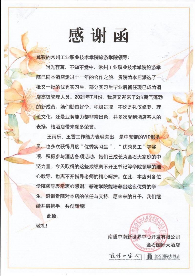 近日,公司旅游与烹饪公司校企合作单位——南通金石国际大酒店发来一封感谢函。