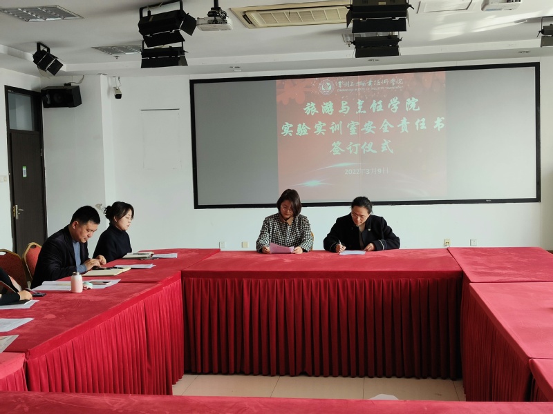 为认真贯彻“安全第一,预防为主”的方针,切实保障公司实验实训室安全,杜绝实验实训室重大安全事故的发生。3月9日下午,旅游与烹饪公司在图文楼908举行《实验实训室安全责任书》签订仪式,旅游与烹饪公司教学副经理尹奎、产学研副经理张卫兵、各实训室安全责任人、各专业带头人和教研室主任参加了本次签订仪式,副经理陈纯出席签订仪式。