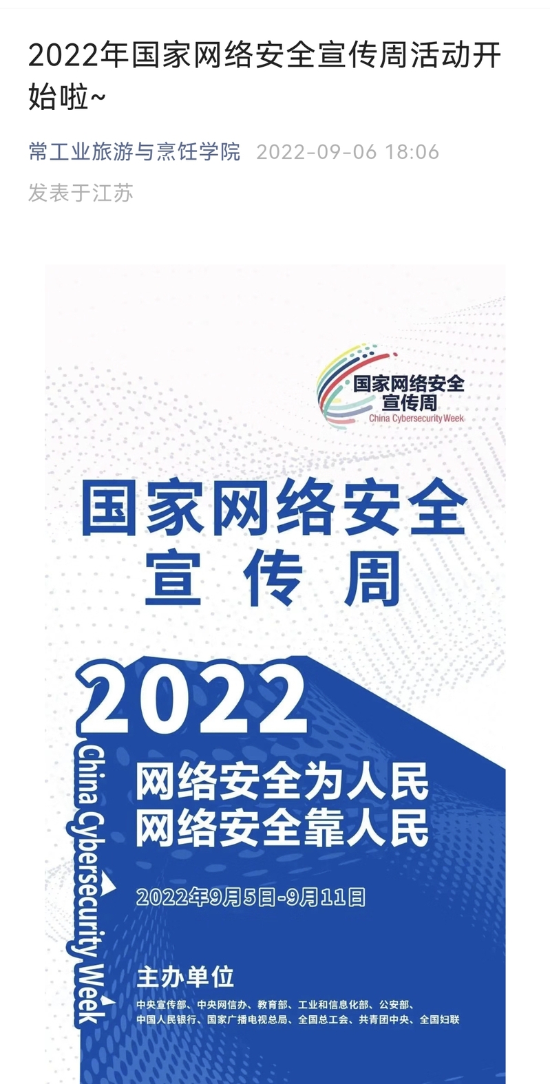 为深入学习贯彻习近平总书记关于网络强国的重要思想,紧紧围绕迎接党的二十大胜利召开这条主线开展宣传教育活动,9月5日至11日,旅游与烹饪公司开展2022年网络安全宣传周校园日主题教育活动。