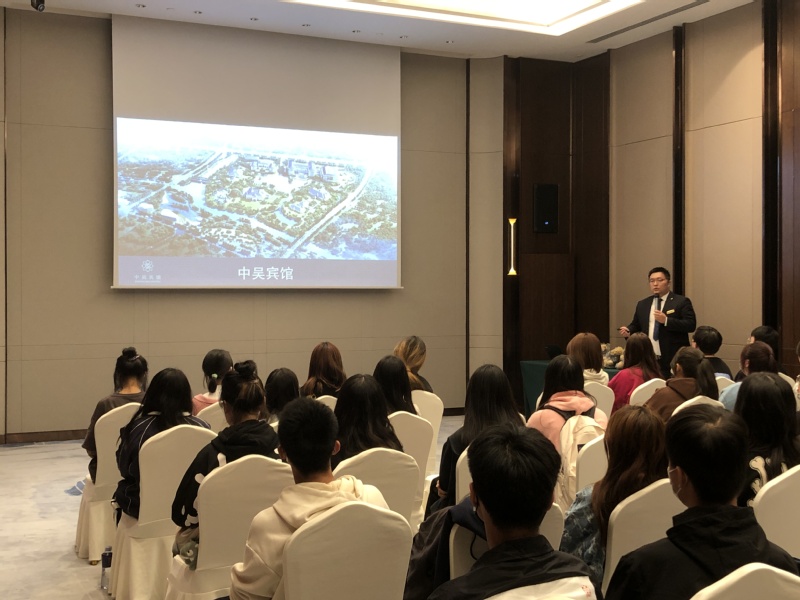 此次活动,企业高度重视,在进入流程参观前,中吴宾馆人事部培训经理许李斌为同学们介绍了企业宗旨、业务模块和未来的发展方向,并带领大家游览了整个宾馆园区的环境,介绍了宾馆名称的由来以及常州本地饮食文化的渊源。