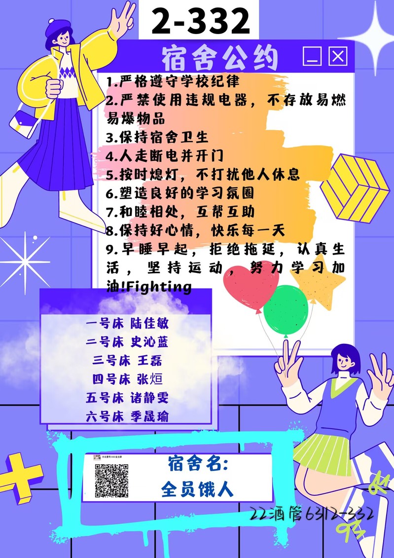 心随约动,共建宿舍“心”家园。为进一步推进同学们形成良好的生活习惯,打造良好的宿舍环境,调节宿舍人际关系,心理辅导站面向全体在校员工发起“DIY宿舍公约”设计评比。同学们从宿舍卫生、作息、安全和日常活动等方面经过宿舍会议讨论达成一致,并制作了精美的公约海报。同学们积极参与,40多个宿舍,约240人次的同学参与了本次活动。