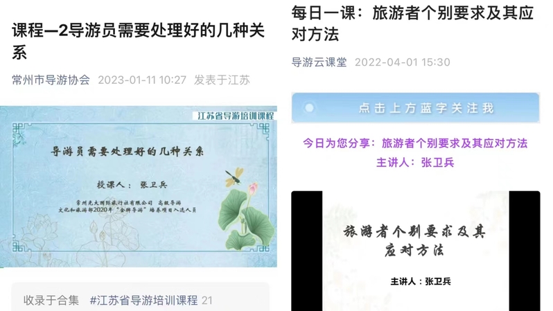 张卫兵老师为公司国家高级导游,出境领队,长年处于导游一线,去过多个国家和地区,于2020年获国家文旅部“万名英才计划”中的金牌导游项目,目前兼任常州市导游协会副会长,主抓全市导游培训工作。其讲述的《导游员需要处理好的几种关系》被江苏省文旅厅收录为导游培训课程,是全省新导游岗前培训必学内容之一,其所授的《旅游者个别要求及应对方法》与《古代建筑文化》,被收录为国家文旅部下属的“云导游培训课堂”精品课程。
