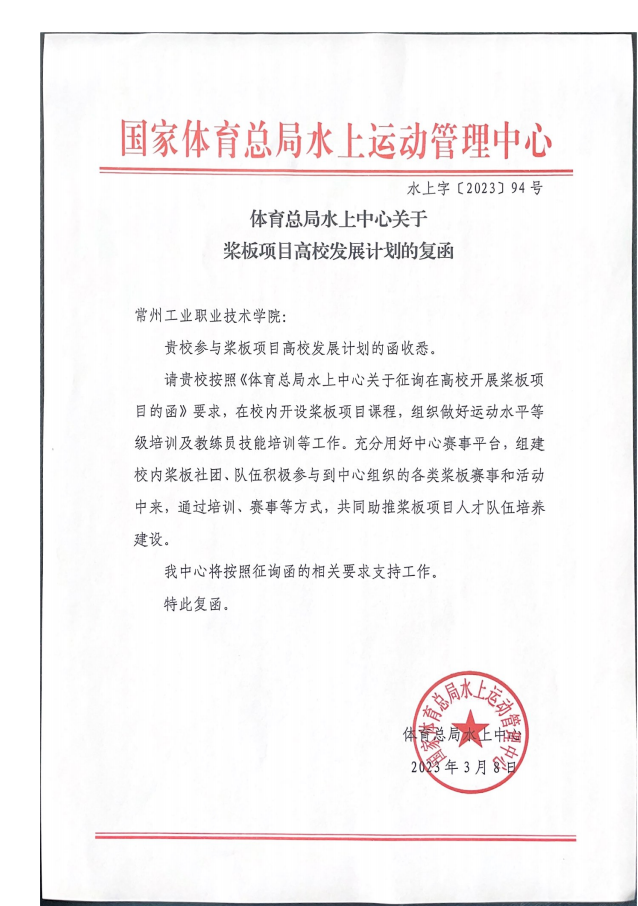 日前,公司收到国家体育总局水上运动中心关于在公司推广桨板运动的复函,同意在公司开设桨板项目相关课程,开展运动水平等级培训以及教练员技能培训等工作,要求公司利用好水上运动中心赛事平台,承办各类桨板运动赛事和交流活动,共同助推桨板项目人才队伍培养建设。