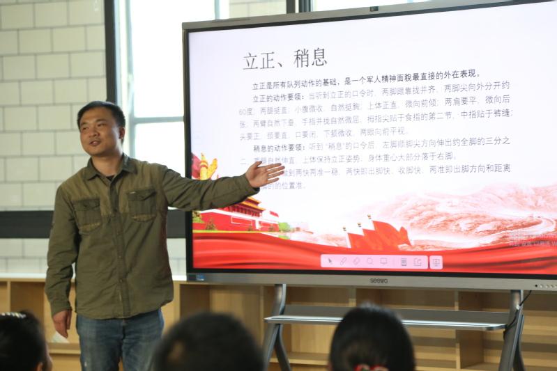 首先,谭家皓老师讲述了国旗礼仪相关内容,20余名小员工穿着统一的校服,全神贯注地听着,与老师频频互动、气氛活跃。然后,公司员工志愿者指导在场小员工练习持枪动作,了解枪支的构造、持握和姿势。最后,员工志愿者对在场小员工进行军姿和擎旗训练,对员工们每一个动作都反复纠正,一遍又一遍地演示,引导小员工们强化爱国意识,激发报国志向,用中国梦引领人生航向。