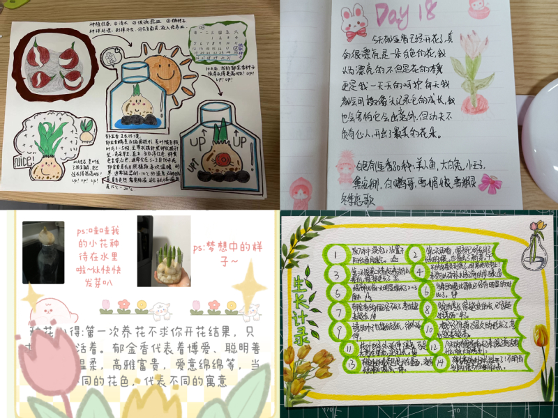 用爱呵护每一朵花,用心拥抱每一个春。3月,公司心理辅导站精心准备了郁金香和风信子的花种,供同学们领取后在宿舍种植,并记录种植心情手账。活动一经发布就得到同学们的踊跃支持,有100余名同学报名领取花种,通过水培、土培等方式进行种植。通过20余天的细心呵护,无论种植成功与否,同学们纷纷通过手账表达出自己的心情。22烹饪631的孙卫星同学在手账中写到:“把花放在那孤零零的几天,再去查看发现已经开出了一些紫色的小花。手心手背都是肉,虽然开的有些拘谨,但不影响你的美丽。正如《小王子》里讲的那样,也许这世界上也有五千朵,和你一模一样的花,但只有你是我独一无二的玫瑰。因为你在你的植物身上注入了新血、情感,你见证了一段生命的成长并参与其中,所以你养的每一盆植物,都是这世间独一无二的玫瑰。”本次花种种植活动使得同学们在与植物亲密接触的过程中,释放不良情绪,感受生命积极向上的力量。