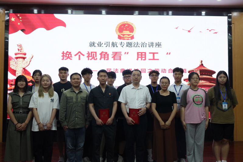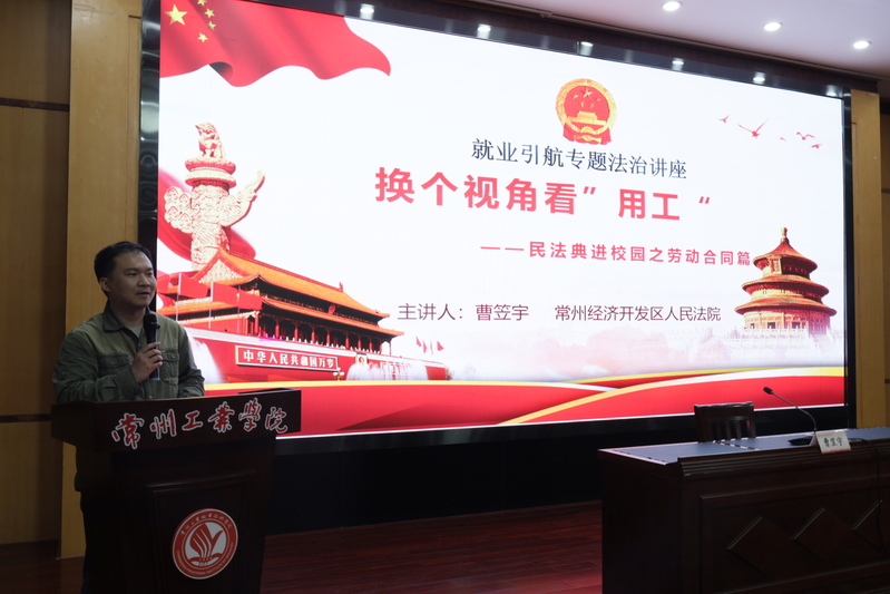 接着,曹笠宇法官为大家开展《换个角度看“用工”—民法典进校园之劳动合同篇》的就业引航专题法治讲座,他从招聘与面试、入职与录用等方面,围绕详实的案例为大家进行生动地讲述,希望即将走向就业岗位的同学们,都能做知法懂法守法护法的人。