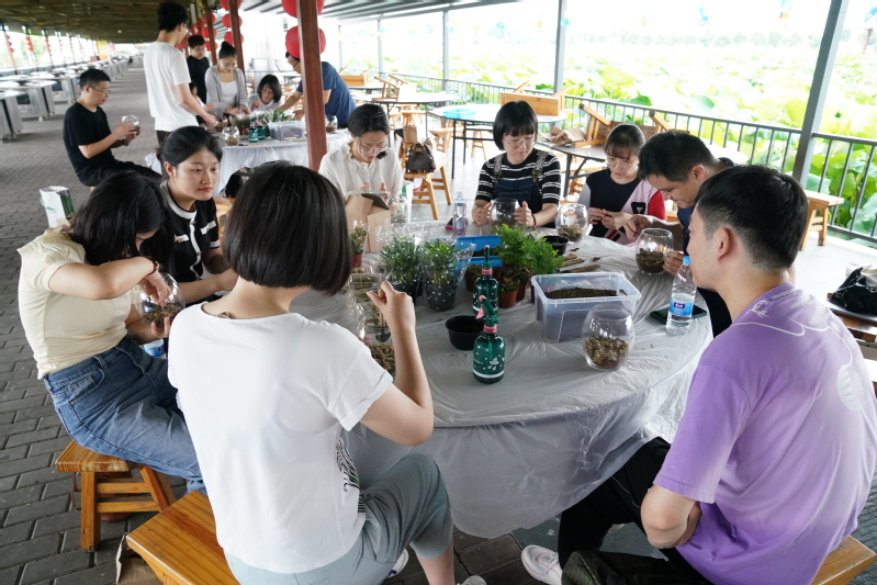在厨荷园,教师们在基地老师的指导下,按照《制作植物微景观》的课程,专心致志完成微景观制作,体会植物美学的乐趣,感受自然生态的魅力和劳动的快乐。土灶旁,教师们按照《食育课程操作流程》淘米、洗菜、生火、煮饭、切菜、颠勺、调味、起锅,美味佳肴摆满了饭桌。课后,项目负责老师对实操课进行了点评,要求教师们深入钻研课程标准,关注员工的真实体验,注重跨学科渗透,让员工在劳动中体验,在实践中感悟,培养员工的劳动素养。