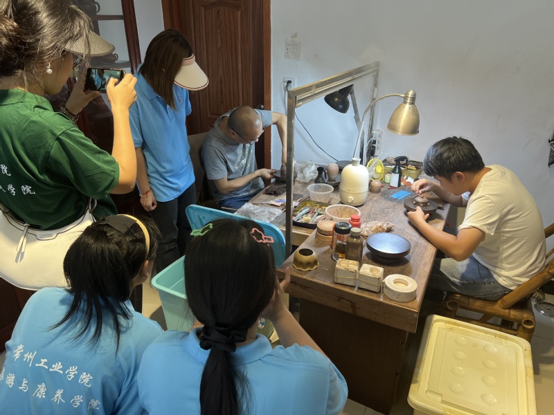动手实操,传递匠心新感悟。怀揣着对紫砂壶工艺大师的敬仰,实践团来到了本次社会实践的第二站-宜兴紫砂工艺厂风雅紫砂工作室。风雅紫砂工作室负责人梁建华先生热情地招待了到访师生,并就宜兴紫砂壶的起源与紫砂壶制作的基本方法为大家做了科普,并采用手工成型的方法为大家现场展示如何制作出一把紫砂壶的基本轮廓,在场师生认真观摩,表现出十分浓厚的兴趣与热爱。随后,实践团师生在工作室工作人员的指导下,简单地制作出壶身、壶盖等,看着自己的劳动成果,大家脸上充满了喜悦,实践团22幼儿635班张梦凡同学说到:动手实践的过程不仅是传统工艺的传承,也将个人的情感赋予了作品,每一个伟大的作品背后是匠人的匠心,是择一事便要终一身的工匠精神。