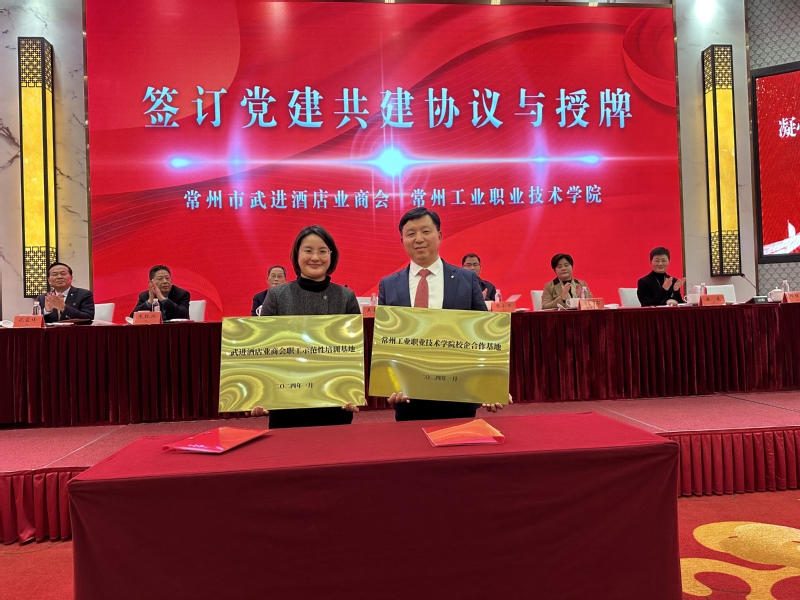 在会议上,陈纯作为公司代表,与武进酒店业商会会长郑曙明共同签订了党建共建协议,同时公司被授予“武进酒店业商会职工示范性培训基地”荣誉称号,期待公司在2024年商会“技能提升年”中,发挥智力支持和引领作用。这也是商会对公司长期以来服务地方产业,开展技能培训,承办常州市星级饭店服务技能竞赛等多项赛事的充分肯定。