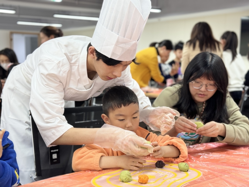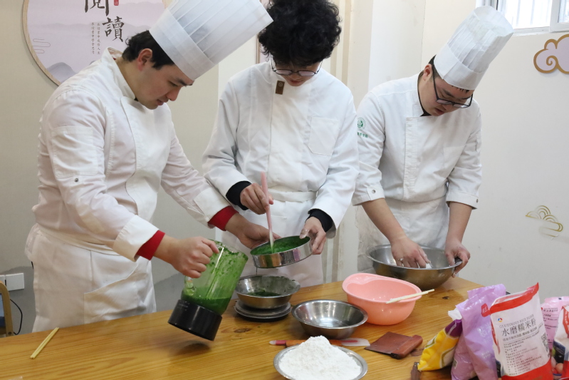 青团寄情,清明寻味。青团是江南人家在清明节吃的传统特色点心,形状圆润,食材丰富,始于唐代,流传千年,象征家庭团圆和幸福安康。烹饪专业的员工志愿者现场教小朋友捣青草为汁,和粉作团,将准备好的面团和将蛋黄、肉松、豆沙等馅料切块、揉捏、塑形、包团……采用揉、捏、拍、打等手法,一个个通体青绿、圆润饱满的小小青团就做好了,小朋友们拿在手里爱不释手,都恨不得一口咬下去。