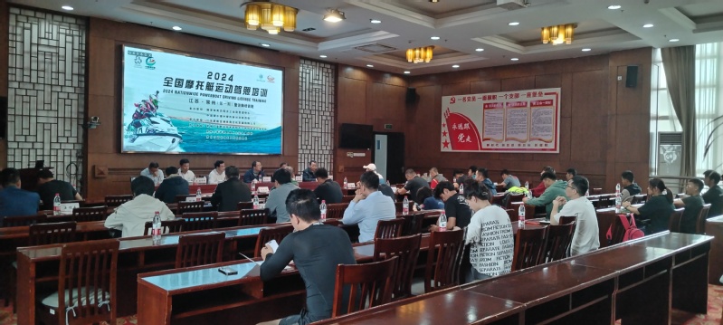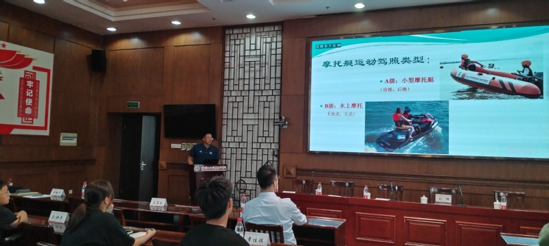 随后,次培训由安徽省水上运动管理中心教练刘伟主讲。他对摩托艇发展历史、动力性能、驾驶规则以及反兴奋剂等具体内容进行了系统阐述。理论课课程侧重摩托艇基本理论知识宣讲,实操培训主要由起步、转向、定点取物等项目构成,侧重摩托艇实际操作流程。