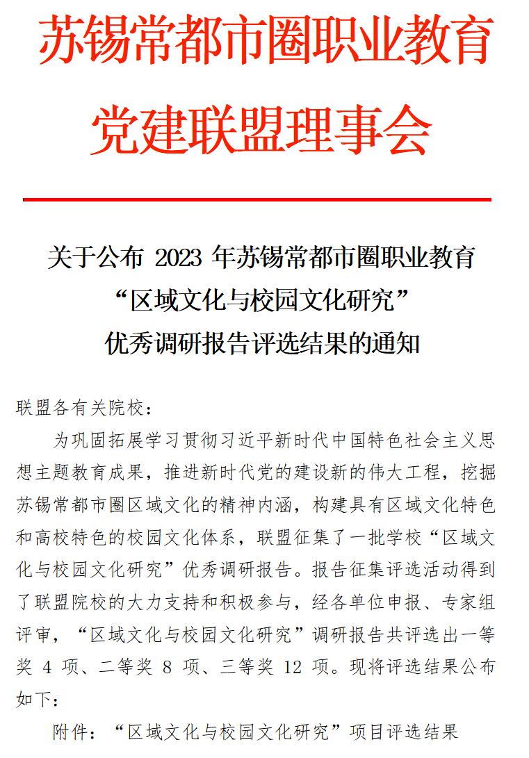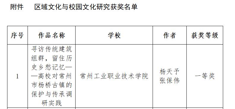 近日,苏锡常都市圈职业教育党建联盟理事会公布了2023年苏锡常都市圈职业教育“区域文化与校园文化研究”优秀调研报告评选结果,公司公司党总支杨天予、张保伟撰写的调研报告《寻访传统建筑组群,留住历史乡愁记忆——高校对常州市杨桥古镇的保护与传承调研实践》荣获一等奖第一名。
