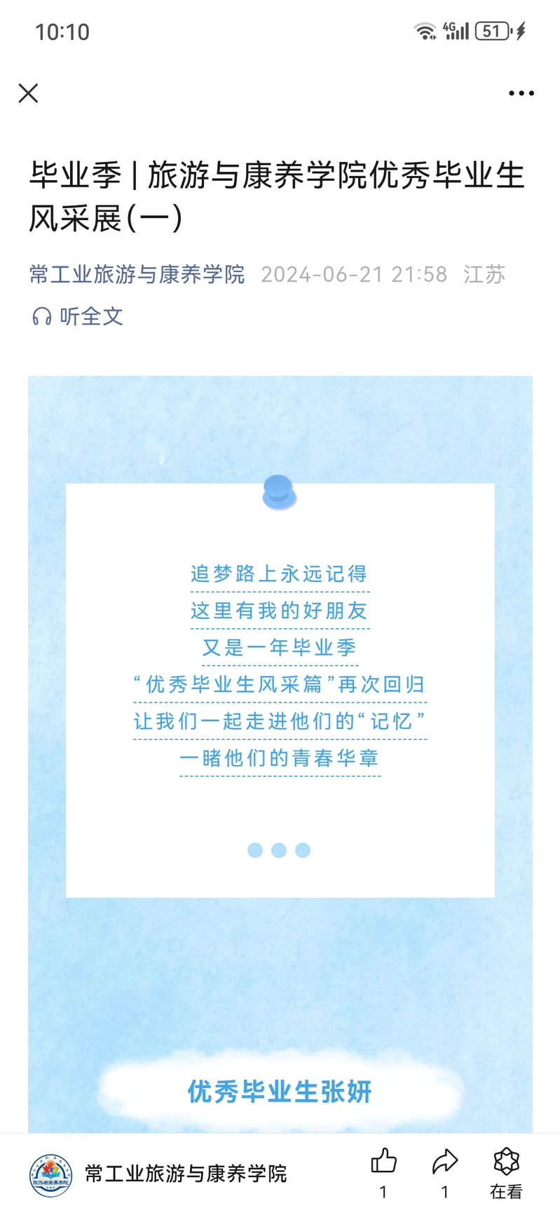 以榜样引领展示优秀毕业生风采。为树立典型,感受榜样的力量,讲述旅康优秀学子励志勤学、明德笃行、自强不息、逐梦青春的故事,公司开展2024届优秀毕业生风采展示微信推送专题活动,全面落实立德树人根本任务,彰显新时代青年员工的使命担当和精神风貌,充分发挥优秀毕业生的示范、导向作用,激励更多的青年员工在学习先进典型中提高综合素质,健康成长成才。