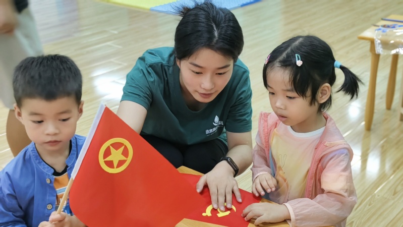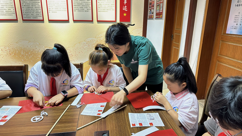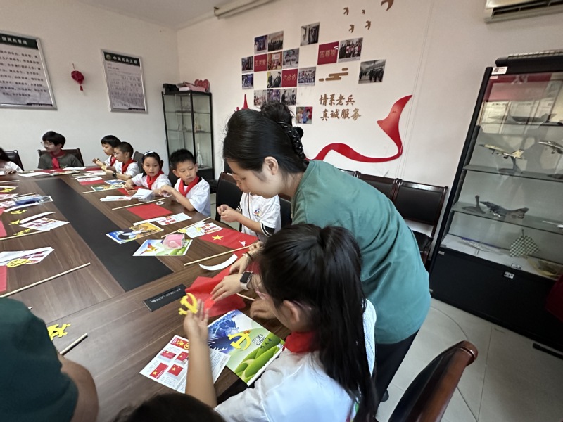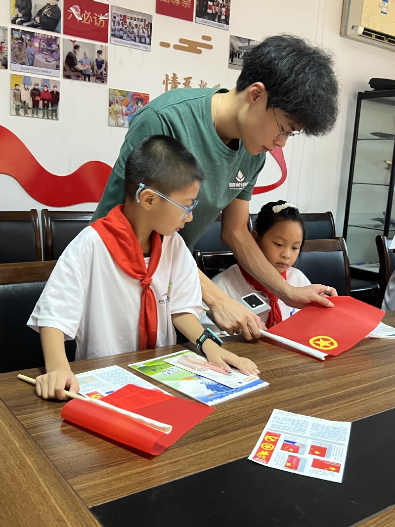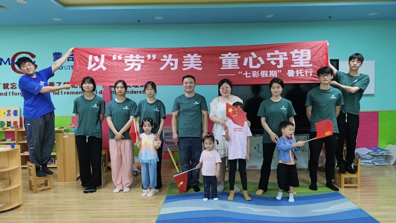 用心开展“实践课”。“以‘劳’为美,童心守望”七彩假期暑托行实践团发挥婴幼儿托育专业特色,在白云社区和校内暑期教职工子女托管班,都以身临其境的体验课程形式教会孩子们制作国旗、党旗、团旗、少先队旗等手工作品,并且科普它们的构成、由来和深刻涵义。员工志愿者不仅向孩子们介绍手工制作的方法和注意要点,而且教会孩子们如何用材料和工具进行正确地摆放和粘贴,在团队师生的指导下,一件件精美的作品在小朋友们指尖诞生。