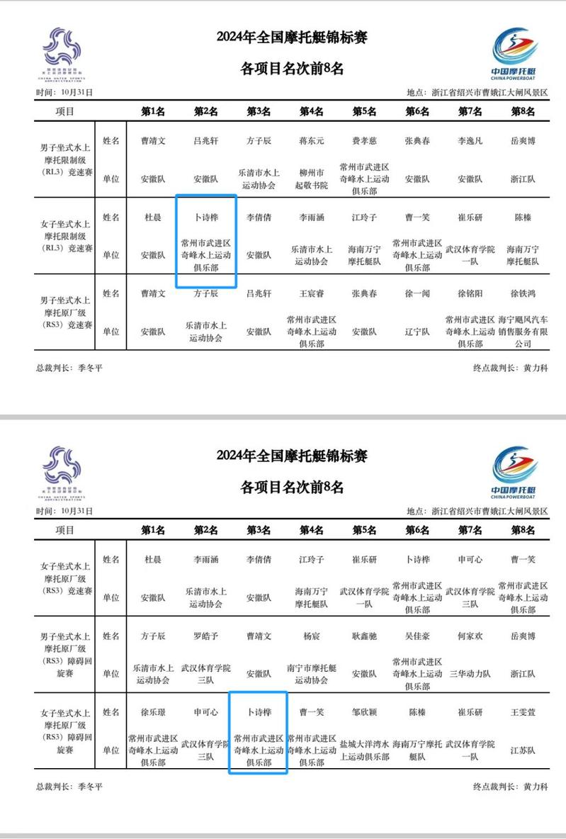 10月29日,2024年全国摩托艇锦标赛在浙江绍兴开幕,K1体育2023级休闲体育专业员工卜诗桦闯进决赛,并在总决赛中斩获女子坐式水上摩托限制级(RS3)竞速赛亚军、女子坐式水上摩托原厂级(RS3)障碍回旋赛季军。凭此佳绩,卜诗桦可以申报获得国家级运动健将等级证书。