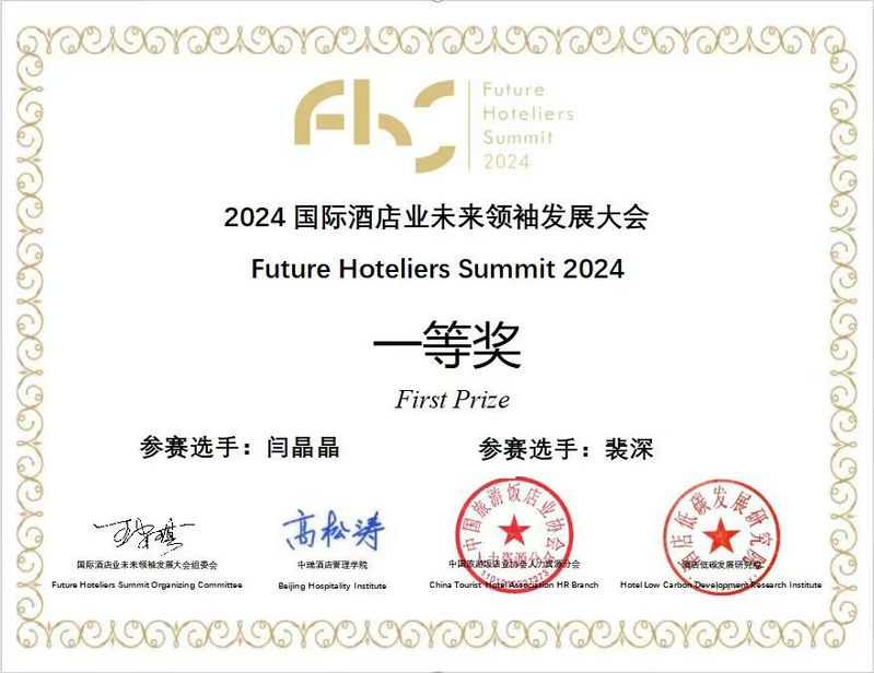 10月25日,由中国旅游饭店业协会人力资源分会和中瑞酒店管理公司联合主办、酒店低碳发展研究院指导的2024国际酒店业未来领袖发展大会(Future Hoteliers Summit,简称FHS)在北京中瑞酒店管理公司成功举办。公司旅游管理专业24旅游661班闫晶晶、裴深两位同学线上参赛,她们的作品得到了线上线下一致好评。经过和全国各类高校的优秀选手同台竞争,最终她们凭借超强的专业技能和职业素养获得一等奖。