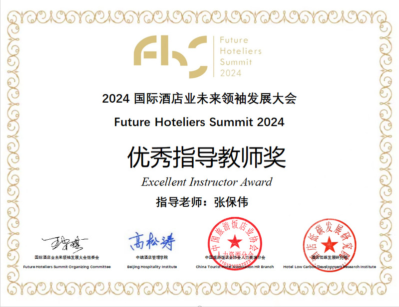 10月25日,由中国旅游饭店业协会人力资源分会和中瑞酒店管理公司联合主办、酒店低碳发展研究院指导的2024国际酒店业未来领袖发展大会(Future Hoteliers Summit,简称FHS)在北京中瑞酒店管理公司成功举办。公司旅游管理专业24旅游661班闫晶晶、裴深两位同学线上参赛,她们的作品得到了线上线下一致好评。经过和全国各类高校的优秀选手同台竞争,最终她们凭借超强的专业技能和职业素养获得一等奖。