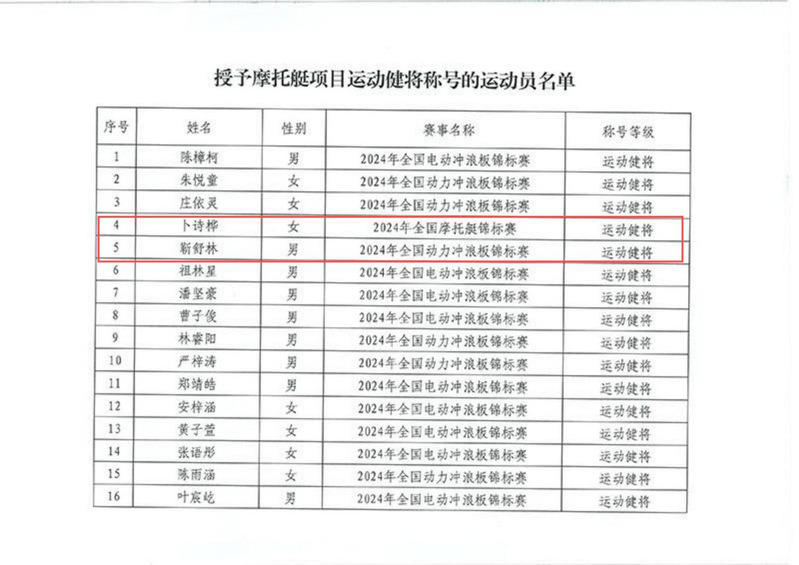 国家体育总局水上运动管理中心近日发布文件,授予16位优秀运动员摩托艇项目国家级“运动健将”称号。其中,公司休闲体育专业卜诗桦和机械设计与制造专业的靳舒林两位在籍员工作为常州工业公司与江苏奇峰体育共同培养的摩托艇项目运动员,成功获此殊荣。值得一提的是,公司员工在此次评选中表现突出,获奖人数占江苏省获奖人数的66.6%,充分展现了公司在摩托艇项目上的强劲实力和人才培养成果。