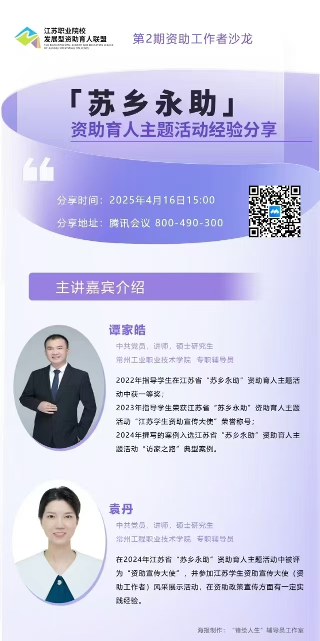 4月16日,江苏职业院校发展型资助育人联盟第二期资助工作者沙龙成功举行,公司教师谭家皓应邀在线上作分享交流。会议由常州工程职业技术公司党委学工部副部长姜庆华主持。