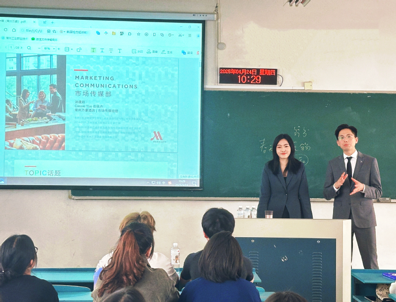 4月24日,常州万豪酒店市场营销部总监丁友军、传媒部经理岳依卉走进酒店管理与数字化运营专业《酒店数字化营销》课堂,酒店人力资源部总监王小丽陪同。