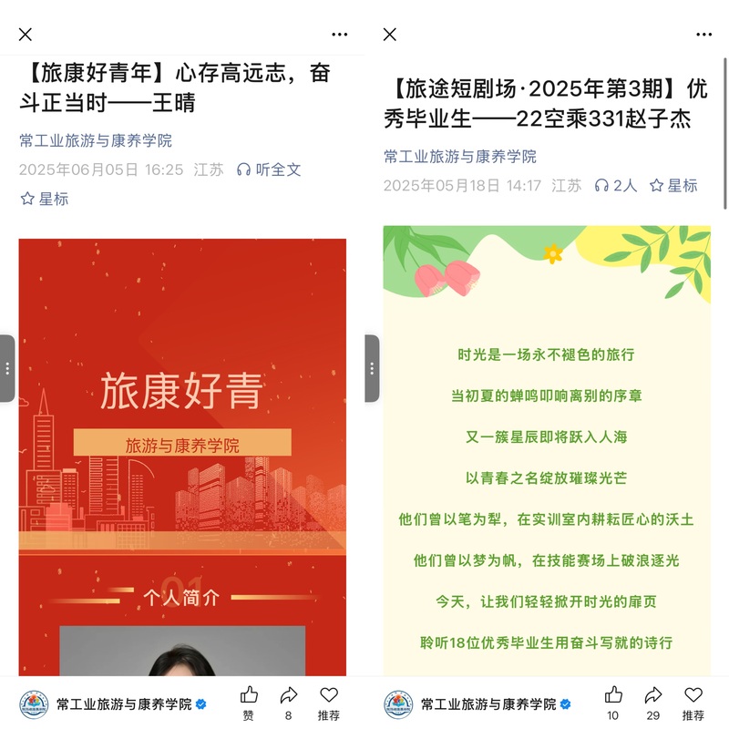 推文展青年担当,榜样引学子发光。为更好地发挥出优秀学子的榜样作用,公司微信公众号推出“旅康好青年”“优秀毕业生”系列精品推文,展现青年学子挺膺担当的青春风貌,也进一步激励同学们增强责任意识,向优秀学子看齐,丰富课余生活,发挥自身特长,在成长的道路上闪闪发光。